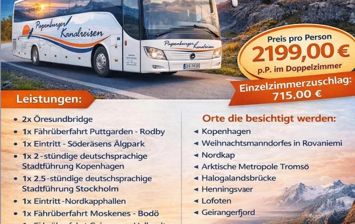 Reiseverlauf Tag 1 – Donnerstag, 2. Juli 2026 Puttgarden – Rødby – Kopenhagen Ihre Reise beginnt mit einer entspannten Fährüberfahrt von Puttgarden nach Rødby, bei der Sie erste Eindrücke der skandinavischen Küstenlandschaft sammeln können. [...]